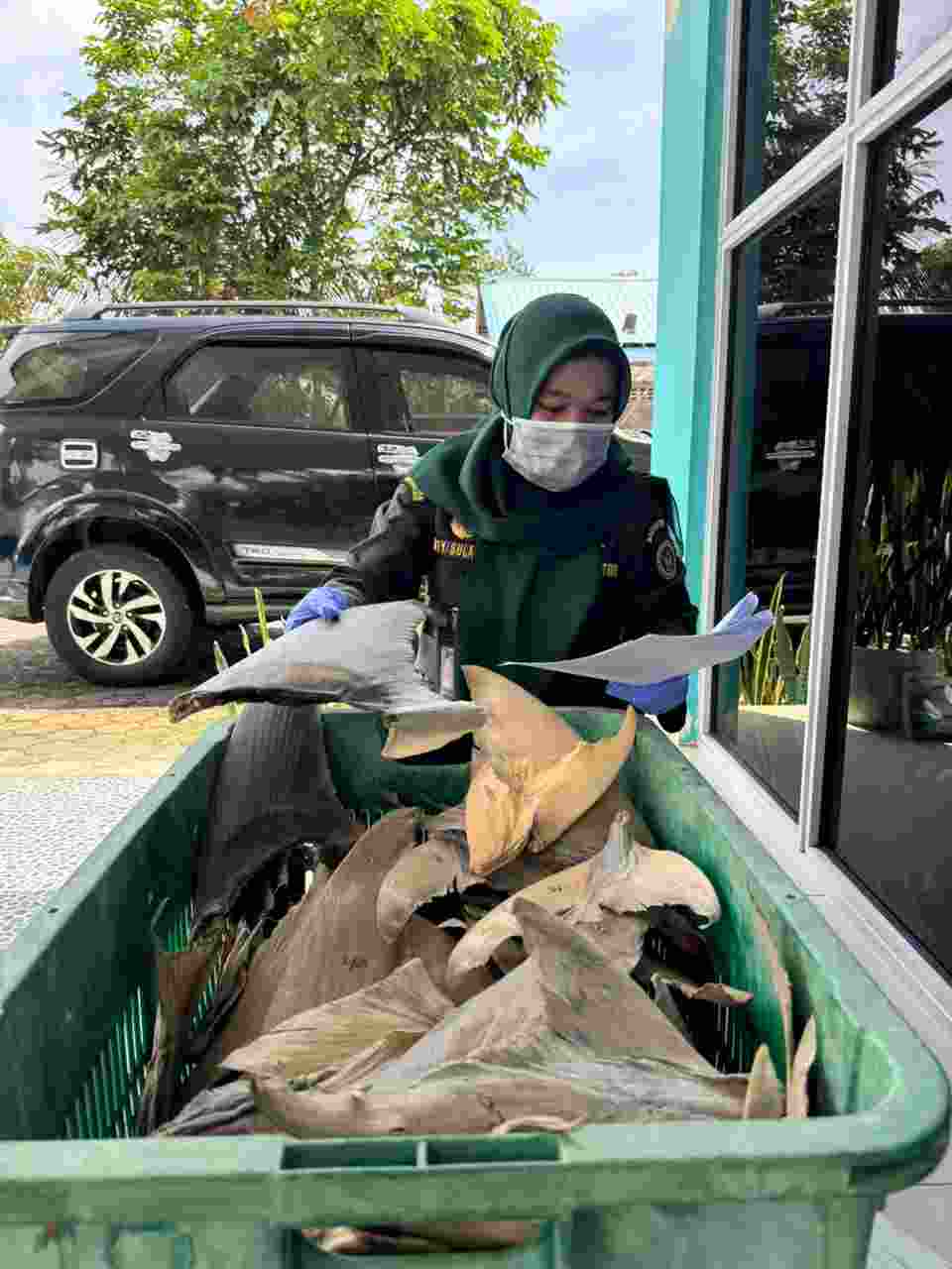 Total 34,35 kg sirip ikan hiu dengan nilai 37,8 juta rupiah yang akan dikirim, terdiri dari 16,25 kg dari hiu kerbau atau _Carcharhinus leucas_ ; 9,55 kg dari hiu pari lontar atau _Rhynchobatus australiae_ ; 2,95 kg dari hiu pari kikir atau _Glaucostegus typus_ ; 2,75 kg dari hiu kejen atau _Carcharhinus limbatus_ ; 2,40 kg dari hiu tenggiri atau _Galeocerdo cuvier_ dan ; 0,45 kg dari hiu kacang atau _Chaenogaleus macrostoma_.