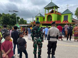 Kupang – Personel Satgas Pamtas RI-RDTL Sektor Barat Yonarhanud 2 Kostrad laksanakan pengamanan di seluruh gereja sekitar Pos Satgas guna mewujudkan rasa aman masyarakat yang beribadah di malam dan pagi hari Natal, Kab. Kupang dan TTU. Kamis (25/12)