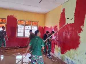 Adapun pekerjaan yang dilakukan meliputi pengecatan dinding ruangan dengan warna putih, pengecatan kusen pintu dan jendela menggunakan cat minyak warna hitam, serta pengecatan tulang dan tiang bangunan dengan kombinasi warna merah. Selain itu, personel juga membersihkan sisa material lumpur akibat genangan air yang terjadi saat hujan.