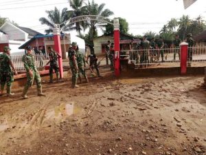Satgas Penanggulangan Bencana Alam (Gulbencal) Kodam I/Bukit Barisan bergerak menormalkan lingkungan sekolah yang sebelumnya tertutup lumpur dan material banjir. Pekerjaan meliputi perataan taman dan halaman, pembersihan teras dan ruang kelas, serta pembersihan lantai dan dinding bangunan.