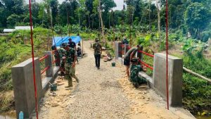 Dalam proses pengerjaan, personel melaksanakan berbagai tahapan pekerjaan mulai dari pemasangan batu sebagai penguat dasar di bawah struktur Armco, pembuatan pembatas jembatan, pengecatan pagar, hingga merapikan badan jalan. Dua unit konstruksi Armco juga telah terpasang sebagai struktur utama jembatan sehingga memperkuat daya tahan dan keamanan jalur penghubung tersebut.
