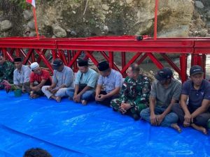 Prosesi _Peusijuek_ berlangsung khidmat dan penuh kebersamaan. Prajurit TNI dan warga setempat duduk bersama mengikuti rangkaian doa, memohon keselamatan serta keberkahan agar jembatan yang telah dibangun dapat memberikan manfaat dan keamanan bagi seluruh masyarakat yang melintasinya.