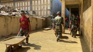 Dengan semangat gotong royong, prajurit TNI AD dari Yonif 115/Macan Leuser turun langsung membersihkan lumpur dan material sisa banjir menggunakan peralatan sederhana seperti cangkul, sekop, dan arco (gerobak dorong). Pembersihan dilakukan menyeluruh, mulai dari ruang kelas, halaman sekolah, hingga membuka saluran air yang tersumbat agar lingkungan sekolah kembali bersih, aman, dan layak digunakan.
