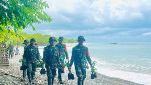 Oepoli – Satgas Pamtas RI-RDTL Sektor Barat Yonarhanud 2 Kostrad Pos Oepoli Pantai, Tengah dan Sungai memberikan bentuk kepedulian terhadap lingkungan dengan menanam 2000 pohon mangrove bersama elemen masyarakat untuk ditanam di pinggir pantau Oepoli, Kec. Amfoang Timur, Kab. Kupang. Senin (9/03/2026).