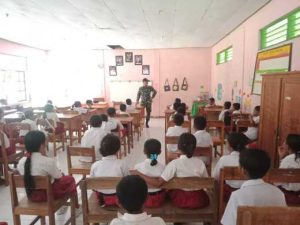 Benus – Personel Satgas Pamtas RI–RDTL Sektor Barat Yonarhanud 2 Kostrad dari Pos Manamas melaksanakan kegiatan sebagai tenaga pendidik di SDK Benus, Desa Benus, Kecamatan Naibenu, Kabupaten Timor Tengah Utara. Kamis (12/03/2026).