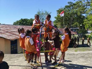 Percantik Suasana Sekolah, Satgas Pamtas Yonarhanud 2 Kostrad Perbaiki Sarana Bermain Paud Saenam