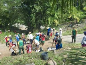 Dengan semangat gotong royong, personel Satgas dan masyarakat bahu-membahu melakukan pengerjaan di lokasi. Selain memperbaiki bagian jalan yang rusak, kegiatan juga mencakup pembersihan material longsoran yang sempat menutup akses jalan, sehingga jalur penghubung antar dusun dapat segera difungsikan kembali.