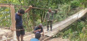 Pekerjaan dilakukan secara gotong royong oleh personel TNI bersama masyarakat setempat. Rehabilitasi meliputi pembersihan area, penggantian papan lantai kayu menjadi plat besi, penggantian besi sling, pengelasan gelagar dan tiang pembatas, serta pengecatan badan jembatan guna memperkuat konstruksi.