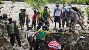 Personel Pos Fohuk bersama warga setempat bekerja sama memperkuat struktur tanggul dengan material yang tersedia agar jalur transportasi tetap aman dan dapat dilalui kendaraan. Jalan Trans Log merupakan akses vital bagi aktivitas masyarakat, terutama dalam distribusi hasil pertanian dan kebutuhan sehari-hari.