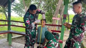 Belu – Personel Pos Salore Satgas Pamtas RI–RDTL Sektor Timur dari Batalyon Armed 12 Kostrad melaksanakan kegiatan pelayanan kesehatan bagi anak-anak di wilayah perbatasan yang bertempat di Pos Salore, Desa Tulakadi, Kecamatan Tasifeto Timur, Kabupaten Belu, Nusa Tenggara Timur, Senin (23/02/2026).