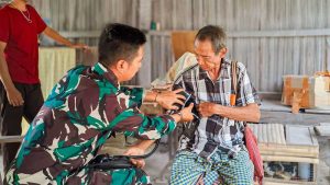 Wini – Satgas Pamtas RI-RDTL Sektor Barat Yonarhanud 2 Kostrad Pos Wini melaksanakan kegiatan pelayanan kesehatan, mengadakan pembagian hasil panen kepada masyarakat, serta berbagi bubur kacang hijau dan snack gratis di SDK Wini, Kec. Insana Utara, Kab. TTU. Rabu (19/11)