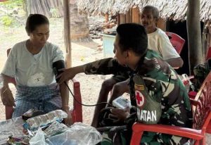 Netemnanu – Satgas Pamtas RI-RDTL Sektor Barat Yonarhanud 2 Kostrad Pos Oepoli Sungai melaksanakan kegiatan kesehatan keliling secara gratis guna tingkatkan kualitas kesehatan masyarakat di wilayah perbatasan, Desa Netemnanu, Kec. Amfoang Timur, Kab. Kupang. Senin (22/12)