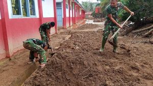 Dalam pelaksanaannya, personel menggunakan berbagai peralatan seperti sekop, cangkul, angkong, sapu, kuas, dan cat untuk membersihkan sisa material banjir sekaligus memperbaiki kondisi lingkungan sekolah. Melalui kerja sama dan gotong royong di lapangan, kegiatan pembersihan berhasil diselesaikan sehingga lingkungan sekolah kembali bersih dan siap digunakan untuk kegiatan belajar mengajar.