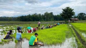 Personel Pos Turiskain bersama para petani turun langsung ke sawah dan bergotong royong menanam padi dengan penuh semangat. Suasana kekeluargaan tampak jelas selama kegiatan berlangsung, mencerminkan sinergi positif antara prajurit TNI dan masyarakat dalam mendukung sektor pertanian lokal.