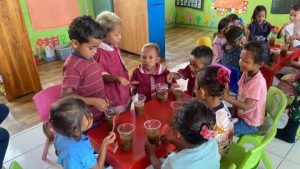 Selain kegiatan belajar mengajar, personel Satgas juga membagikan bubur kacang hijau sebagai tambahan asupan gizi bagi anak-anak. Pemberian makanan bergizi tersebut diharapkan dapat membantu mendukung pertumbuhan dan menjaga kesehatan anak-anak di lingkungan sekolah.